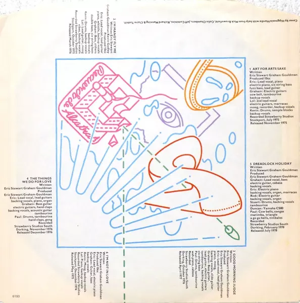 Drums, Backing Vocals, Temple Block Kevin Godley | Guitar, Tambourine, Backing Vocals, Cowbell Graham Gouldman | Lead Vocals, Guitar, Maracas, Synthesizer [Moog], Recorder, Backing Vocals Lol Creme | Lead Vocals, Piano, Electric Piano, Bass [Six String], Bass [Fuzz], Guitar Eric Stewart
