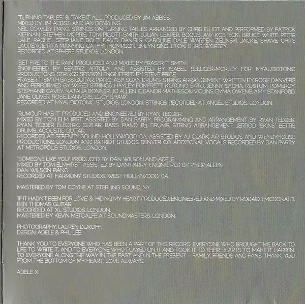 Engineer Mark Rankin | Mixed By Tom Elmhirst | Mixed By [Assistant] Daniel Parry | Producer Paul Epworth | Written-By Adele Adkins, Paul Epworth