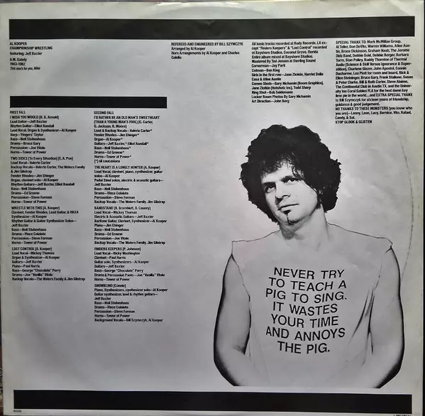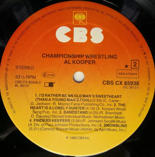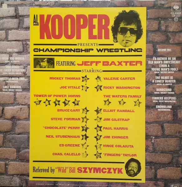 Al Kooper: Championship Wrestling versie op vinyl LP in standaard editie. Deze specifieke uitgave werd uitgebracht in Europa bij uitgeverij CBS in het jaar 1982. Album valt binnen het genre Rock, Funk / Soul, Southern Rock, Soul en Funk. Cx Encoded Vinyl.