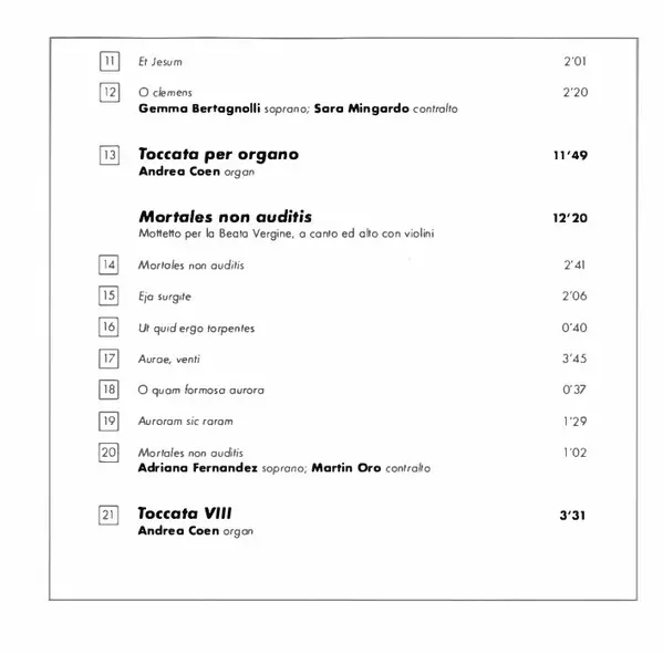| Artiest | Alessandro Scarlatti | Sara Mingardo | Antonio Abete | Furio Zanasi | Gemma Bertagnolli | Martin Oro | Adriana Fernández | Marcello Di Lisa | Concerto De' Cavalieri |