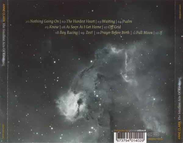 Anne Clark: The Smallest Acts Of Kindness versie op CD in standaard editie. Deze specifieke uitgave werd uitgebracht in Duitsland bij uitgeverij NetMusicZone Records op 26. maart 2021. Album valt binnen het genre Rock, Elektronische muziek, Akoestische muziek, Folk Rock, Downtempo, Experimental, Synth-Pop en IDM.