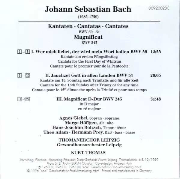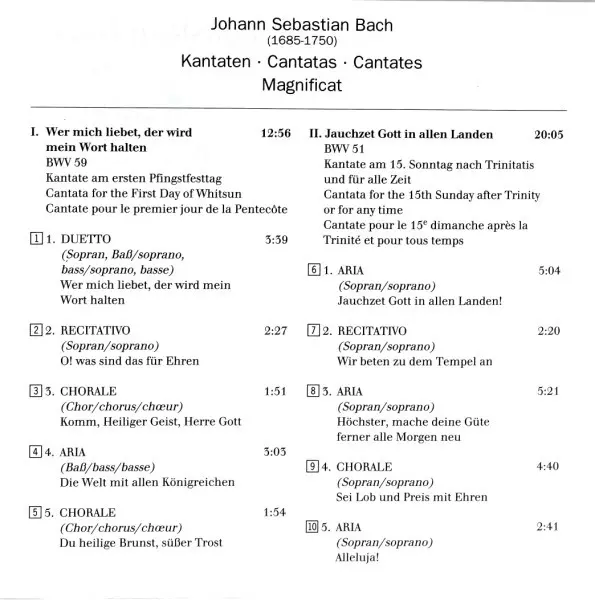 | Titel | Magnificat In D Major BWV 243 / Jauchzet Gott In Allen Landen! BWV 51 / Wer Mich Liebet, Der Wird Mein Wort Halten BWV 59 |