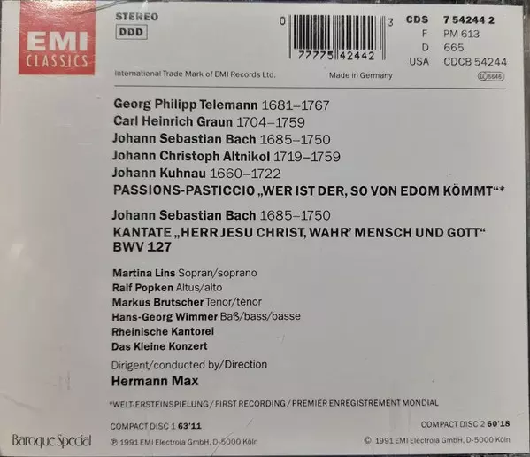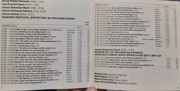 | Artiest | Johann Sebastian Bach | Georg Philipp Telemann | Carl Heinrich Graun | Rheinische Kantorei | Das Kleine Konzert | Hermann Max | Johann Christoph Altnickol |