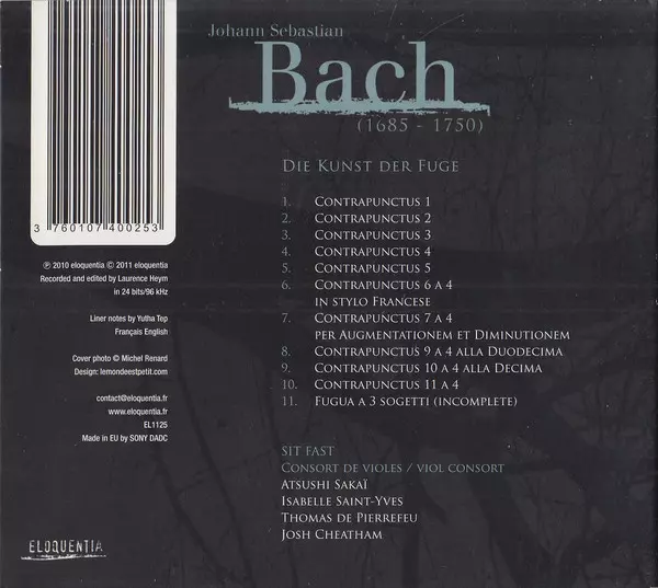 | Bass Viol Joshua Cheatham | Composed By Johann Sebastian Bach | Ensemble [Viol Consort] Sit Fast | Tenor Viol Thomas de Pierrefeu | Treble Viol Atsushi Sakaï, Isabelle Saint Yves | ||