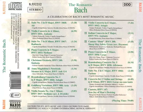 Johann Sebastian Bach: The Romantic Bach (A Celebration Of Bach's Most Romantic Music) versie op CD in standaard editie. Deze specifieke uitgave werd uitgebracht in Duitsland bij uitgeverij Naxos op 18. mei 2009. Album valt binnen het genre Klassieke muziek en Barokmuziek.