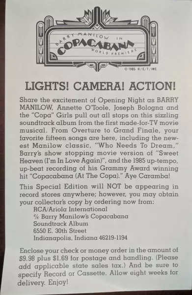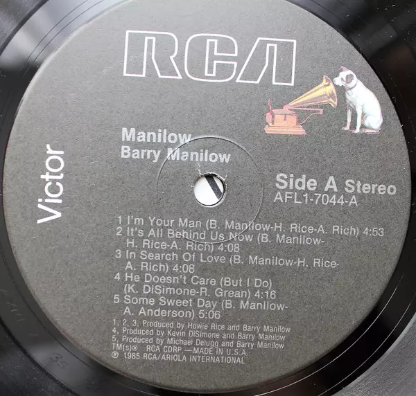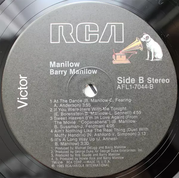 Barry Manilow: Manilow versie op vinyl LP in standaard editie. Deze specifieke uitgave werd uitgebracht in VS bij uitgeverij RCA Victor in het jaar 1985. Album valt binnen het genre Rock, Pop, Ballade en Soft Rock.