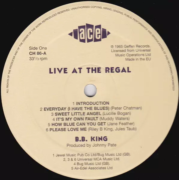 The album was recorded on November 21, 1964 at the Regal Theater in Chicago. It perfectly announces the exceptional talent of B. B. King as a singer, guitarist and entertainer. Rolling Stone" ranked it as the 141st greatest album of all time. "Live at the Regal" includes "Every Day I Have the Blues" and "Sweet Little Angel," among others, songs ...