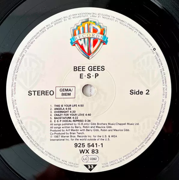 Bee Gees: E∙S∙P versie op vinyl LP in standaard editie. Deze specifieke uitgave werd uitgebracht in Europa bij uitgeverij Warner Bros. Records in het jaar 1987. Album valt binnen het genre Rock, Pop Rock en Synth-Pop.