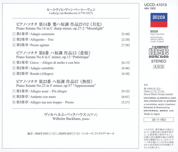 | Titel | The Piano Sonatas Nos.14 "Moonlight", 8 "Pathetique" & 23 "Appassionata" LTD |
