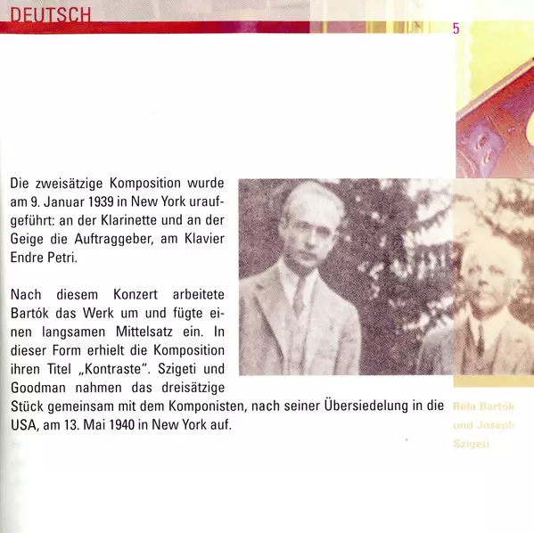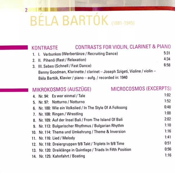 Béla Bartók: Kontraste / Mikrokosmos (Auszüge) versie op CD in remastered editie. Deze specifieke uitgave werd uitgebracht in Europa bij uitgeverij Documents op 2. oktober 2006. Album valt binnen het genre Klassieke muziek en Modernism.