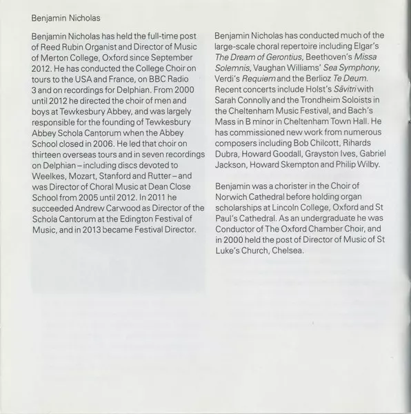 Benjamin Nicholas is a British conductor and organist known for his work in choral music. He has been associated with Merton College, Oxford, where he has served as the Director of Music. In this role, he has been instrumental in the development of the college's choir, which has ga...