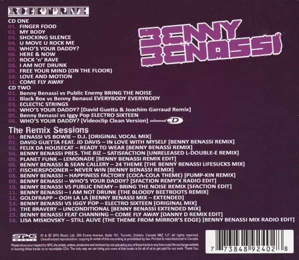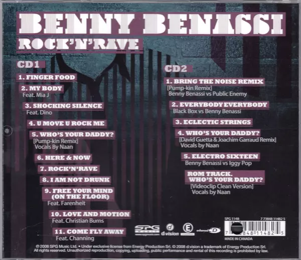 Benny Benassi: Rock'N'Rave / The Remix Sessions versie op 3CD/Doos in standaard editie. Deze specifieke uitgave werd uitgebracht in Canada bij uitgeverij SPG MUSIC op 12. oktober 2010. Album valt binnen het genre Elektronische muziek, Electro, EBM, Electro House en Hard House.