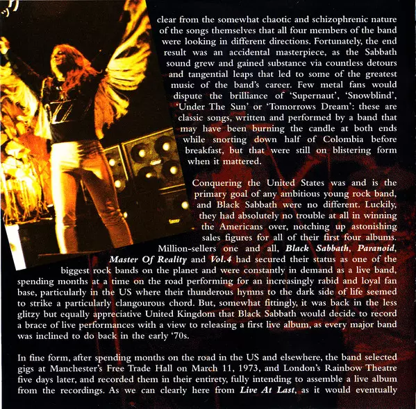 Black Sabbath : Live At Last is an album released in 1980. The album was recorded live at the Hammersmith Odeon in London on 26 November 1979. The album was produced by Black Sabbath and Martin Birch. The album was recorded during the Heaven and Hell tour. The album was the first live album released by Black Sabbath. The album was commercially s...