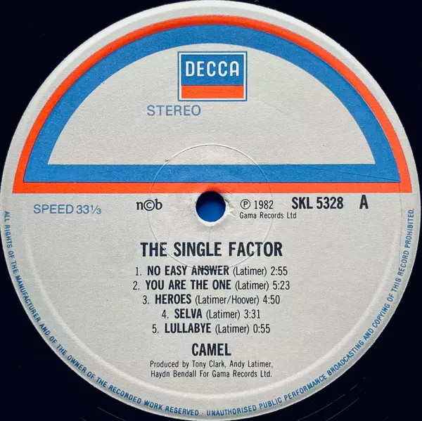Camel: The Single Factor versie op vinyl LP in standaard editie. Deze specifieke uitgave werd uitgebracht in Scandinavië bij uitgeverij Gama (3) in samenwerking met Decca in het jaar 1982. Album valt binnen het genre Rock en Progressive rock.