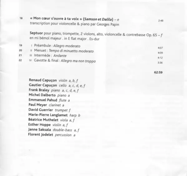 Artiest | Camille Saint-Saëns | Renaud Capuçon | Emmanuel Pahud | Gautier Capuçon | Frank Braley | Marie-Pierre Langlamet | Michel Dalberto | Paul Meyer | David Guerrier | Florent Jodelet | Esther Hoppe | Béatrice Muthelet | Janne Saksala |