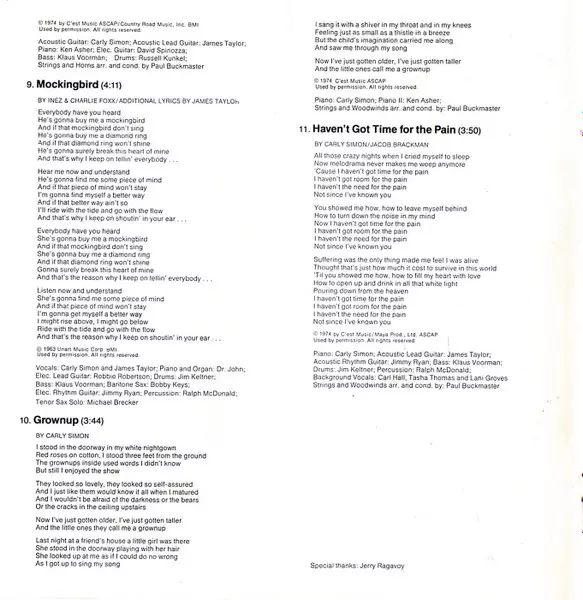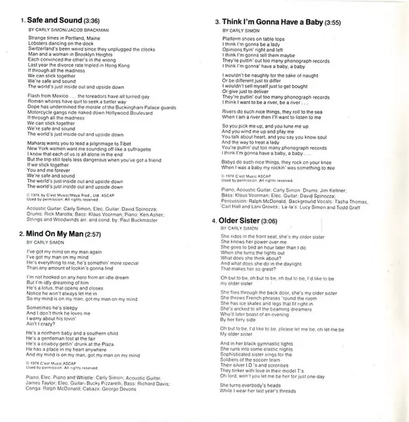 Acoustic Guitar Carly Simon | Arranged By [Strings And Woodwinds Arr. By], Conductor [Strings And Woodwinds Cond. By] Paul Buckmaster | Bass Klaus Voormann | Drums Rick Marotta | Electric Guitar [Elec. Guitar] David Spinozza | Piano Ken Ascher | Written-By Jacob Brackman