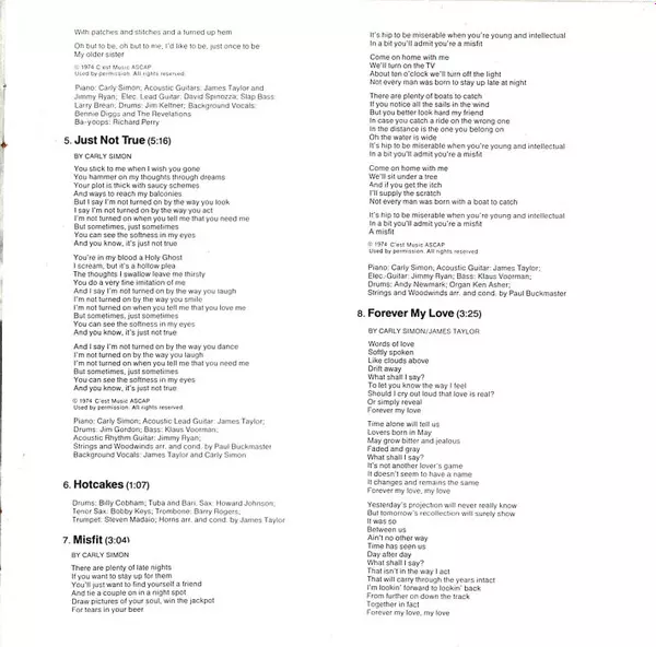 Acoustic Guitar [Acoustic Lead Guitar] James Taylor (2) | Acoustic Guitar [Acoustic Rhythm Guitar] Jimmy Ryan (3) | Arranged By [Strings And Woodwinds Arr. By], Conductor [Strings And Woodwinds Cond. By] Paul Buckmaster | Backing Vocals [Background Vocals] Carl Hall, Lani Groves, Tasha Thomas | Bass Klaus Voormann | Drums Jim Keltner | Percussion Ralph MacDonald | Piano Carly Simon | Written-By Jacob Brackman