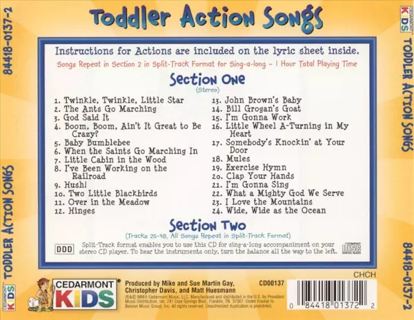 Cedarmont Kids: Toddler Action Songs versie op CD in standaard editie. Deze specifieke uitgave werd uitgebracht in VS bij uitgeverij Cedarmont Music op 5. maart 2002. Album valt binnen het genre Pop, Folk, World, & Country, Kinderen en Nursery Rhymes.