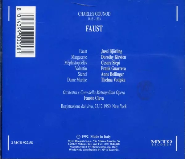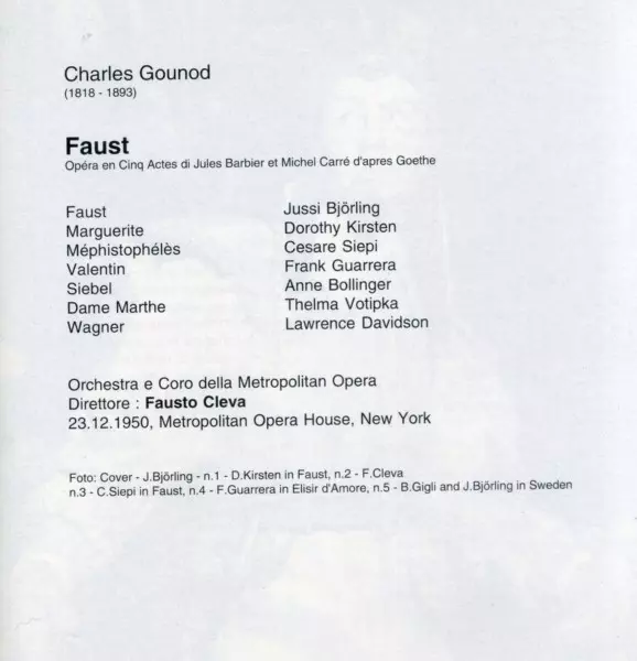 | Artiest | Charles Gounod | Jussi Björling | Cesare Siepi | Fausto Cleva | Frank Guarrera | Dorothy Kirsten |