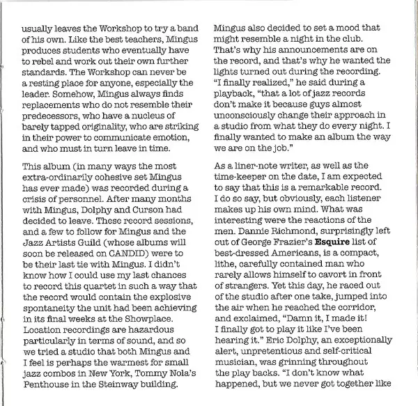 In 1960, Charles Mingus was approached by the famous jazz critic Nat Hentoff with an offer to make some recordings for the new Candid label. Mingus had a completely free hand in every respect. The result of the first recordings was released as Charles Mingus Presents Charles Mingus (Candid CJM8005) and here he appears with two additional tracks ...
