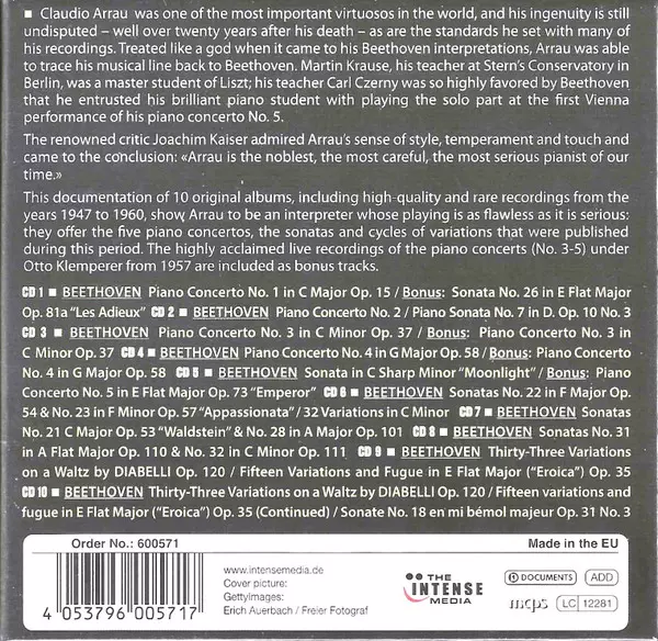 Claudio Arrau: Plays Beethoven, Milestones Of A Piano Legend versie op 10CD in standaard editie. Deze specifieke uitgave werd uitgebracht in Europa bij uitgeverij The Intense Media in samenwerking met Documents op 18. september 2020. Album valt binnen het genre Rock, Pop, Klassieke muziek, Stage & Screen, Pop Rock, Romance en Soundtrack.