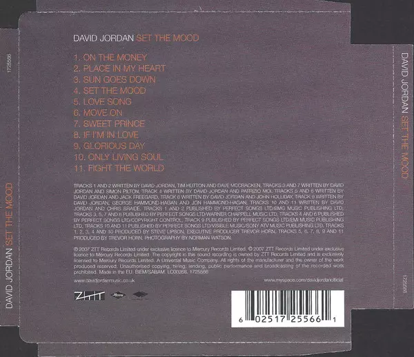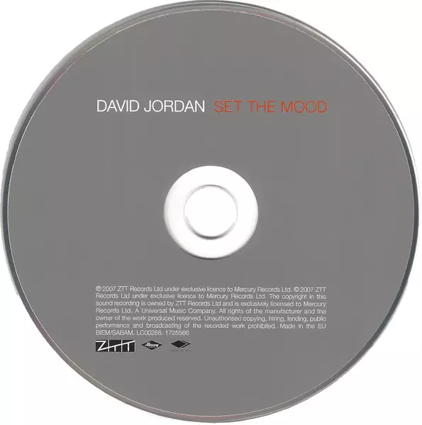 David Jordan: Set The Mood versie op CD in standaard editie. Deze specifieke uitgave werd uitgebracht in Verenigd Koninkrijk bij uitgeverij Mercury in samenwerking met ZTT op 2. juni 2015. Album valt binnen het genre Pop, Funk / Soul, Pop Rock en Soul.