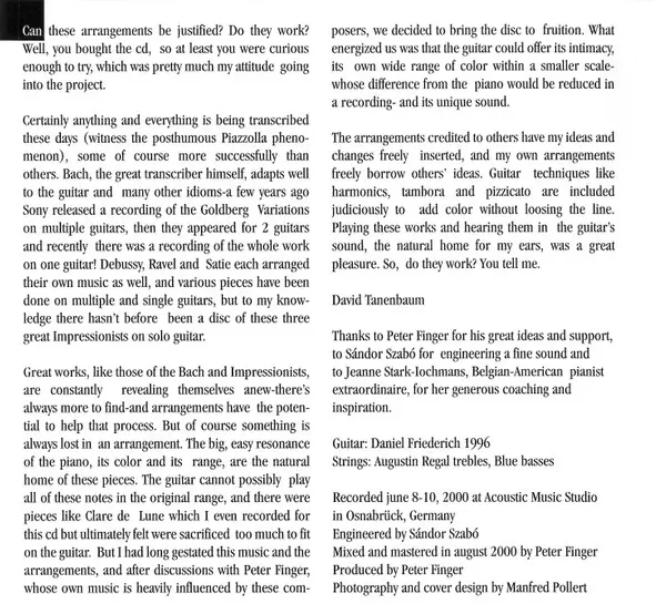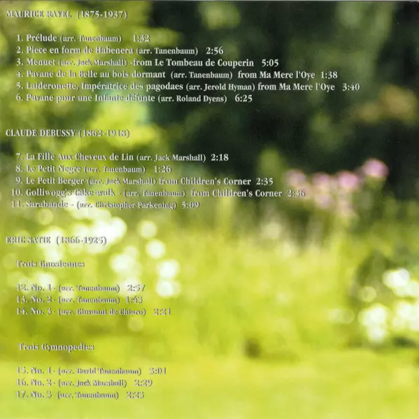 | Artiest | Claude Debussy | Maurice Ravel | Erik Satie | David Tanenbaum |