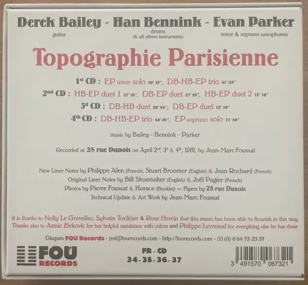 | 1-2 | Evan Parker, Han Bennink, Derek Bailey: DB-HB-EP trio | 41:53 min | |