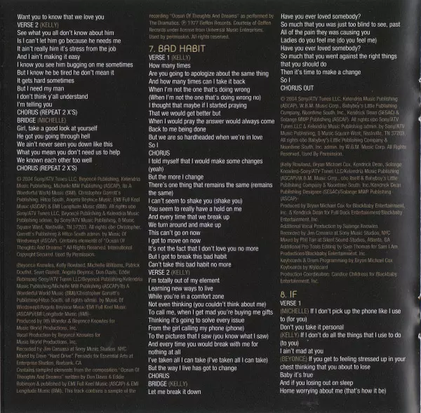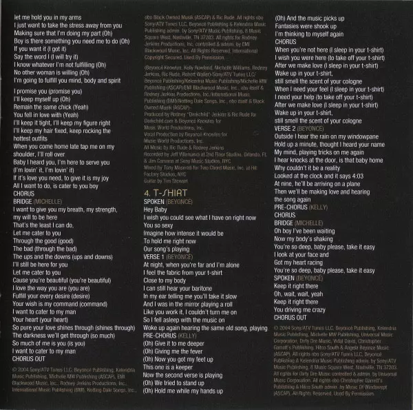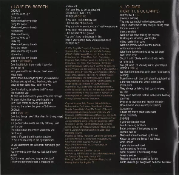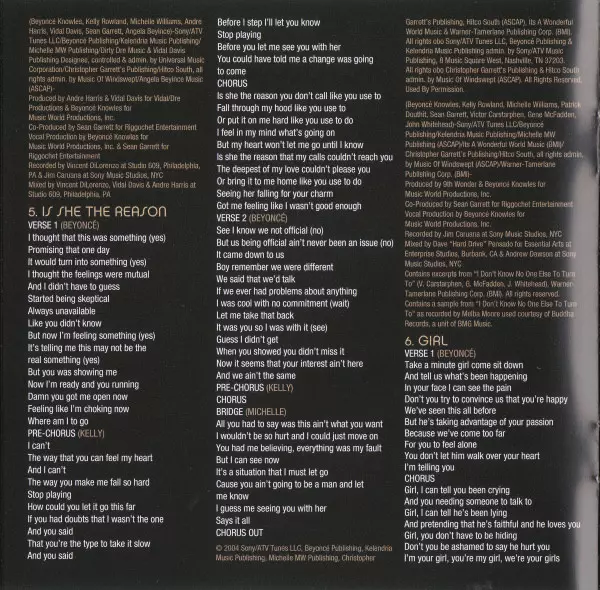 Co-producer, Producer [Vocals] Sean Garrett | Mixed By Andre Harris (2), Vidal Davis, Vincent Dilorenzo | Producer Andre Harris (2), Vidal Davis | Producer, Producer [Vocals] Beyoncé Knowles | Recorded By Jim Caruana, Vincent Dilorenzo | Written-By Andre Harris (2), Angela Renee Beyince, Beyoncé Knowles, Kelly Rowland, Michelle Williams, Sean Garrett, Vidal Davis
