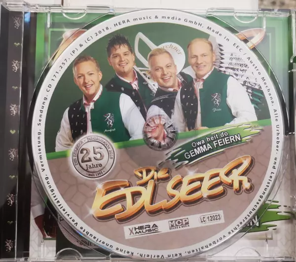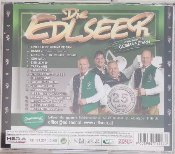Die Edlseer: Owa Heit Do Gemma Feiern versie op CD in standaard editie. Deze specifieke uitgave werd uitgebracht in Oostenrijk bij uitgeverij HERA Music op 4. mei 2018. Album valt binnen het genre Pop, Folk, World, & Country, Schlager en Volksmusik.