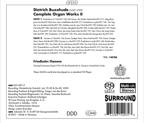 Dieterich Buxtehude: Complete Organ Works II versie op 2SACD in standaard editie. Deze specifieke uitgave werd uitgebracht in Europa bij uitgeverij cpo op 20. december 2022. Album valt binnen het genre Klassieke muziek, Barokmuziek en Organ.