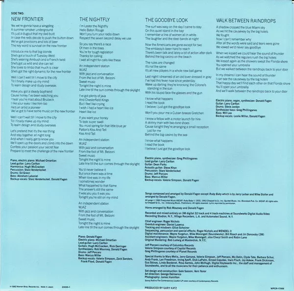 Backing Vocals Donald Fagen, Leslie Miller | Bass Will Lee | Drums Steve Jordan | Electric Piano, Organ, Synthesizer Donald Fagen | Guitar Larry Carlton | Synth Bass [Synthesizer Bass] Greg Phillinganes
