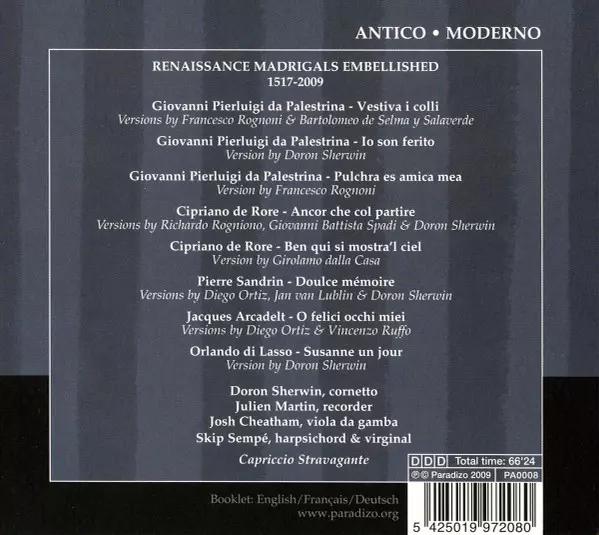Capriccio Stravagante: Antico • Moderno - Renaissance Madrigal's Embellished versie op CD in standaard editie. Deze specifieke uitgave werd uitgebracht in Frankrijk bij uitgeverij Paradizo op 3. februari 2011. Album valt binnen het genre Klassieke muziek, Barokmuziek, Contemporary classical, Renaissance en Madrigal.