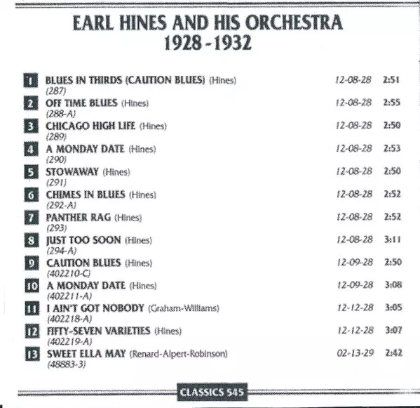 | 13 | Earl Hines And His Orchestra: Sweet Ella May | 2:42 min | |
