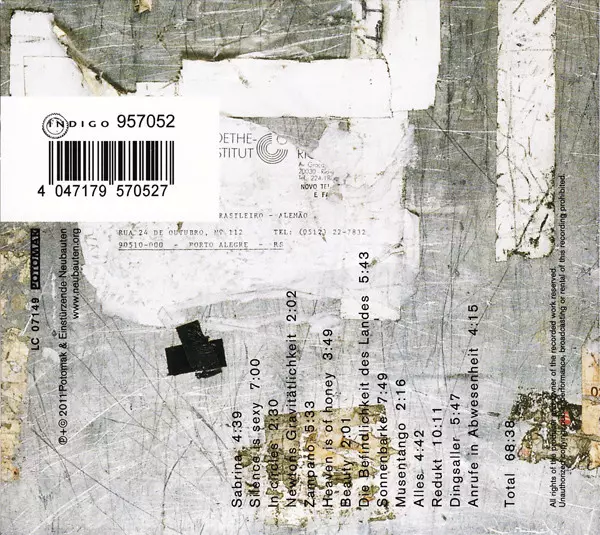 Arranged By Alexander Hacke, Andrew Chudy, Blixa Bargeld, Jochen Arbeit, Rudi Moser | Percussion [Amplified Strings] Andrew Chudy | Percussion [Plastic] Rudi Moser | Voice [Cellular Phone], Piano [Fender Rhodes Electric] Blixa Bargeld | Voice [Speaking] Alexander Hacke | Voice [Telephone] Christian Meyer, Elsa Wormeck, Fetisch, Frank Künster, Jan Tilman Schade, Johannes Beck, John Norris, Kain Karawahn, Lars Rudolph, Peer Martiny, Peppi, Petra Wende, See Sea, Stefan Plank, Thomas Wydler, Tristan Thönnissen, Ulrike Haage, Violetta Cyrol | Written-By Traditional