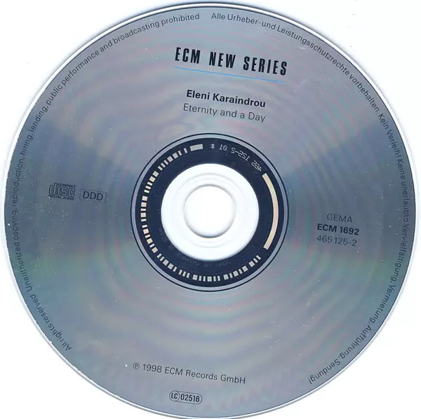 Eleni Karaindrou: Eternity And A Day versie op CD in standaard editie. Deze specifieke uitgave werd uitgebracht in Duitsland bij uitgeverij ECM New Series op 18. januari 1999. Album valt binnen het genre Klassieke muziek, Stage & Screen, Contemporary classical en Soundtrack.