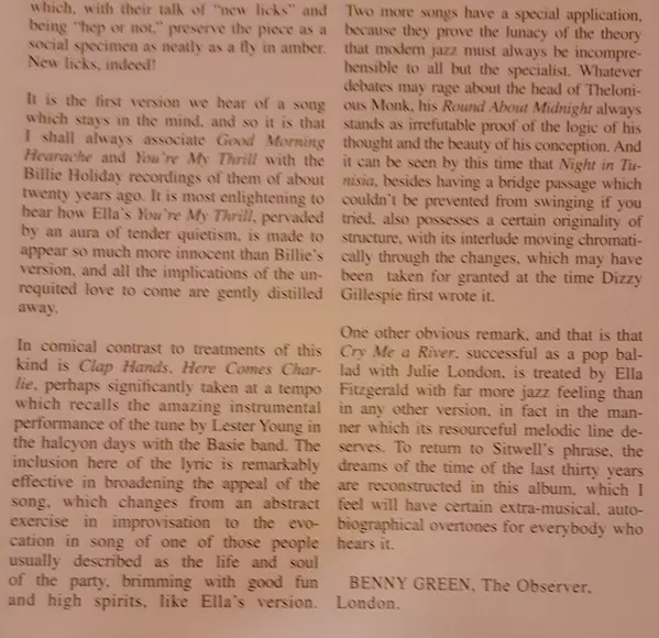 14 titles from the heyday of swing, written between 1930 and 1945, heard again and again in the dance halls and radio commercials of this world, and re-recorded and very distinctively interpreted by Ella Fitzgerald in 1961. The jazz singer is accompanied by Herb Ellis (guitar), Gus Johnson (drums), Stan Levey (percussion), Lou Levy (piano), Wilf...