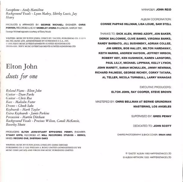 | Backing Vocals Jay Henry, Lynn Mabry, Shirley Lewis | Bass Deon Estus | Drums Jonathan Moffett | Engineer Chris Porter | Guitar Danny Jacob, Martin Bliss | Keyboards Chris Cameron, Dave Clayton | Lyrics By Bernie Taupin | Music By Elton John | Percussion Danny Cummings | Producer, Arranged By George Michael | Saxophone Andy Hamilton (7) | |||