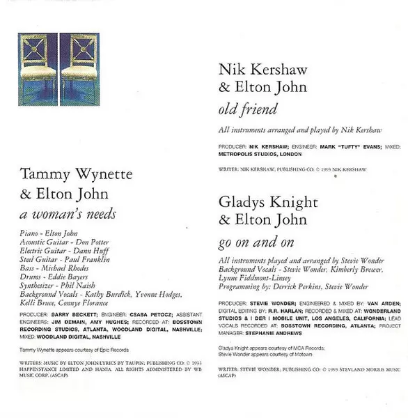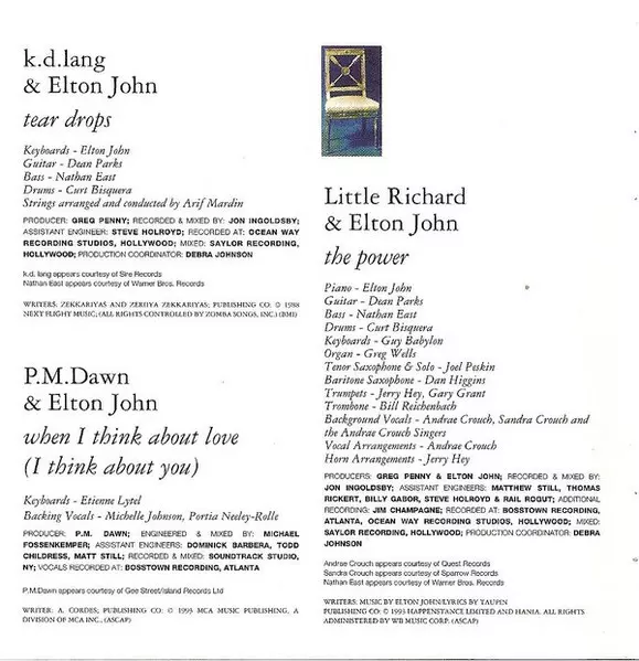 | Arranged By [Horn Arrangements] Jerry Hey | Arranged By [Vocal Arrangements] Andraé Crouch | Backing Vocals Andraé Crouch, Sandra Crouch, The Andraé Crouch Singers | Baritone Saxophone Dan Higgins | Bass Nathan East | Drums Curt Bisquera | Engineer [Assistant] Billy Gabor, Matt Still, Rail Rogut, Steve Holroyd, Thomas Rickert | Guitar Dean Parks | Keyboards Guy Babylon | Lyrics By Bernie Taupin | Mixed By, Recorded By Jon Ingoldsby | Music By Elton John | Organ Greg Wells | Producer Elton John, Greg Penny | Recorded By [Additional] Jim Champagne | Tenor Saxophone Joel Peskin | Trombone Bill Reichenbach (2) | Trumpet Gary Grant, Jerry Hey | |||