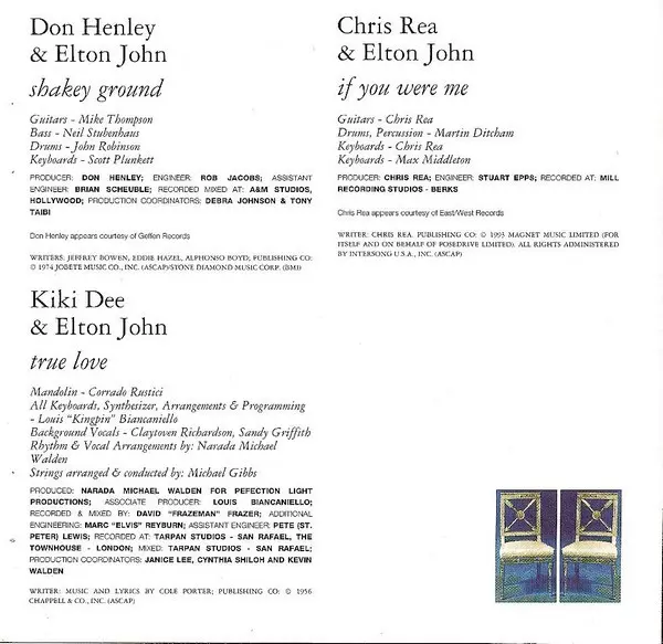 | Backing Vocals Beverley Skeete, Candy McKenzie, Precious Wilson | Bass Malcolm Foster | Drums Chuck Sabo | Engineer Stuart Epps | Guitar Chris Rea, Dean Parks | Keyboards Jamie Perkins, Mark Taylor (7) | Lyrics By Chris Difford | Music By Elton John | Percussion Martin Ditcham | Producer Elton John, Greg Penny, Stuart Epps | |||