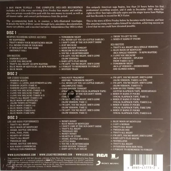 A deluxe 3-CD package featuring the most comprehensive collection of songs from Elvis Presley's early years ever available; all of Sun's famous masters and outtakes; live recordings; radio recordings; recordings of Elvis' first self-financed acetate records; recently discovered and previously unreleased recordings; and much more. Includes a 120-...