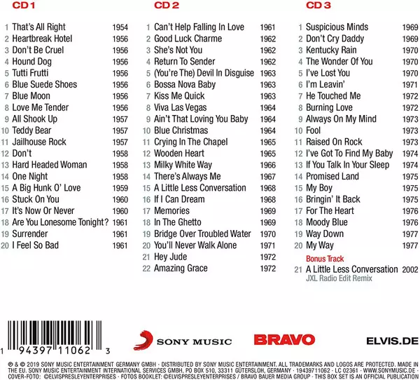 - Unique 3CD album for Elvis' 85th birthday! - All the hits and rarities as well as selected gems like My Way and Hey Jude - Official BRAVO edition and the first ever BRAVO for one artist! - Limited first edition of 15,000 copies in a deluxe digipack - Physical release only and only by GSA - Probably the best Best Of all time for German speaking...