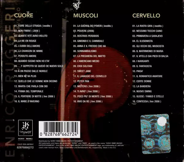 Enrico Ruggeri: Cuore Muscoli E Cervello versie op 3CD in standaard editie. Deze specifieke uitgave werd uitgebracht in Italië bij uitgeverij ANYWAY in samenwerking met Sony BMG Music Entertainment op 16. april 2013. Album valt binnen het genre Rock, Pop, Vocaal, Pop Rock en Soft Rock.
