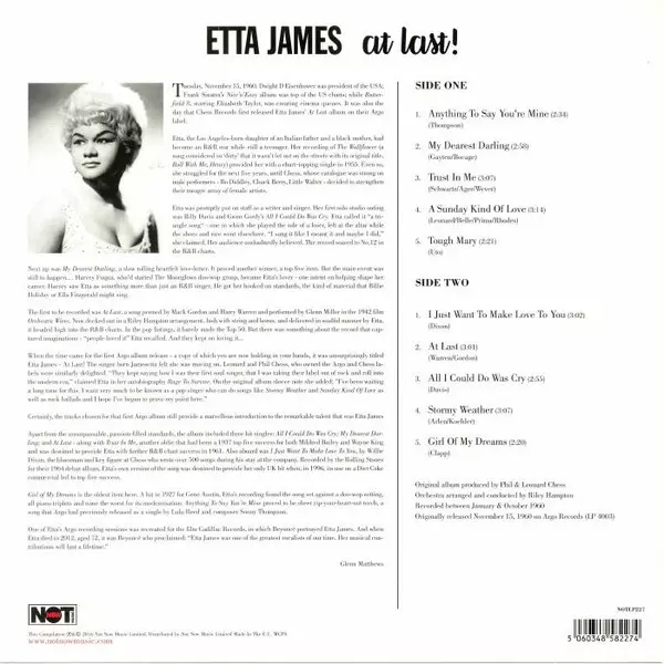 Five years after the chart-topping single "The Wallflower", her first studio album "At Last!" was finally released. This album contained four of Etta's hits that made it to the R&B charts. Undoubtedly a great album that clearly proves that Etta was one of the greatest singers of all time and her music will forever remain in the hearts of her fans.