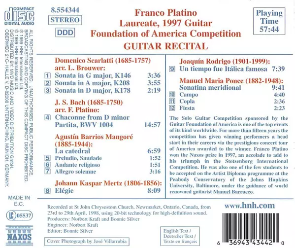 | Artiest | Johann Sebastian Bach | Domenico Scarlatti | Joaquín Rodrigo | Manuel María Ponce Cuéllar | Agustín Barrios Mangoré | Johann Kaspar Mertz | Franco Platino |