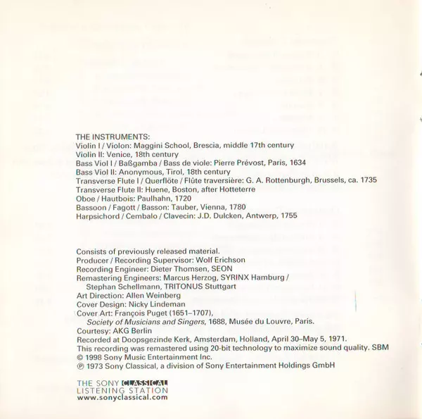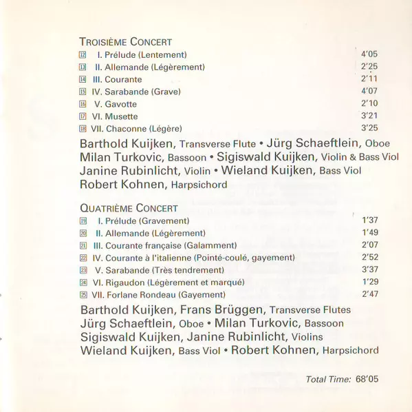 | Bass Viol Wieland Kuijken | Harpsichord Robert Kohnen | Oboe Jürg Schaeftlein | Traverso [Transverse Flute] Barthold Kuijken | Treble Viol, Bass Viol Sigiswald Kuijken | Violin Janine Rubinlicht | ||