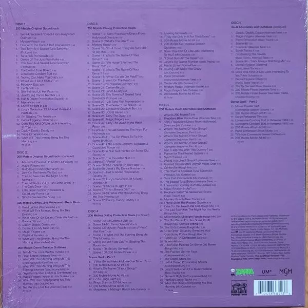 "200 motelů" Franka Zappy. Na oslavu slavného "surrealistického dokumentu" z roku 1971 nyní vychází původní soundtrack v reedici jako remasterované dvojCD nebo dvojLP (180g) s kompletním původním balením včetně bookletu a plakátu a také jako limitovaný super deluxe box set se šesti CD se soundtrackem a spoustou bonusového materiálu, včetně demosnímků, studiových výstupů, mixů, rozhovorů a dalších. Deluxe set je zabalen v 64stránkové knize s pevnou vazbou v obalu o rozměrech 12ʺ × 12ʺ. Obal odpovídá původnímu bookletu, který je doplněn o nové zasvěcené poznámky Pamely Des Barres, Ruth Underwood a Joe Traverse, stejně jako o esej Patricka Pendinga z reedice z roku 1997, a je plný obrázků z filmu a jeho natáčení, z nichž mnohé nebyly dosud nikdy publikovány. Součástí sběratelské edice je také speciální klíčenka "200 motelů", věšák na dveře motelů "Nerušit" a replika původního plakátu k filmu ve skutečné velikosti. Příslušný tracklisiting naleznete níže.