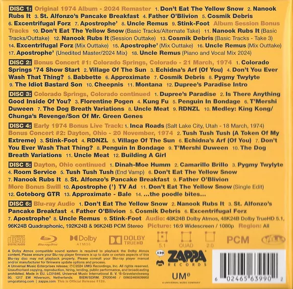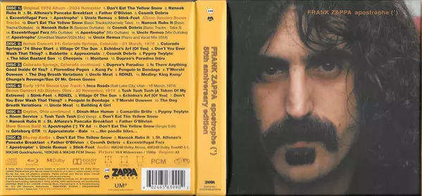 Frank Zappa: Apostrophe (') DLX | LTD versie op 5CD/Doos/Blu-ray in remastered deluxe limited editie. Deze specifieke uitgave werd uitgebracht in Europa bij uitgeverij Zappa Records in samenwerking met UMe op 13. september 2024.