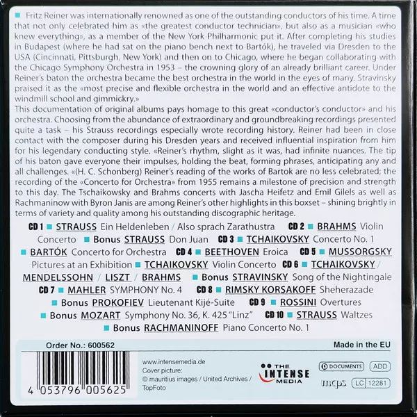Fritz Reiner: Fritz Reiner & The Chicago Symphony Orchestra: Milestones Of A Legendary Conductor versie op 10CD/Doos in standaard editie. Deze specifieke uitgave werd uitgebracht in Europa bij uitgeverij The Intense Media in samenwerking met Documents op 24. juli 2020. Album valt binnen het genre Klassieke muziek, Modernism en Romance. Wallet Box.