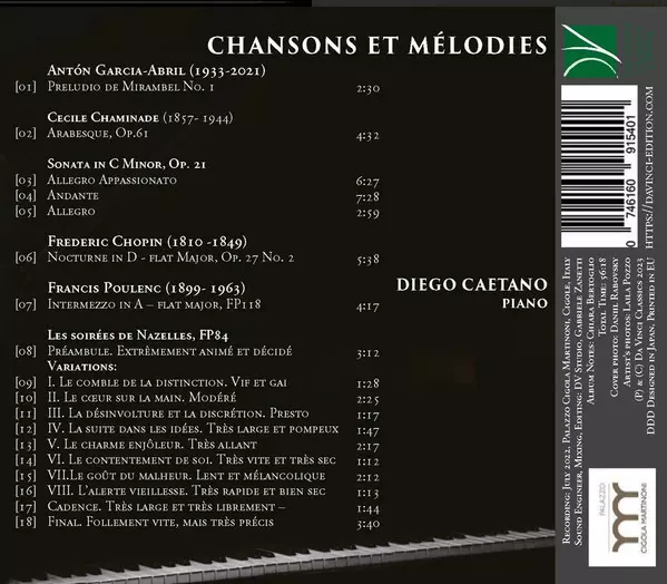 | Artiest | Frédéric Chopin | Francis Poulenc | Cecile Chaminade | Antón García Abril | Diego Caetano |